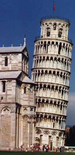 Turm (Campanile): Der Baubeginn des freistehenden Glockenturms war 1173. Bereits nach der Vollendung des dritten Stockwerks stellte man die Neigung des Turms fest, obwohl man vorher ausgiebig nach gutem und festem Boden gesucht hatte. Der